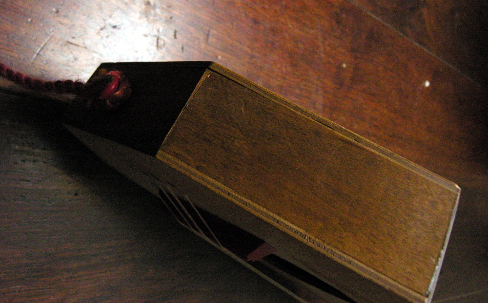 L'instrument est complet, avec toutes les clefs d'origine en forme de rames, même la corde est d'origine cependant elle s'est rompue. L'excroissance de la tête a été solidement réparée, ce qui est légèrement visible de très près (voir photo), mais ne gêne ni l'accordage ni le jeu.